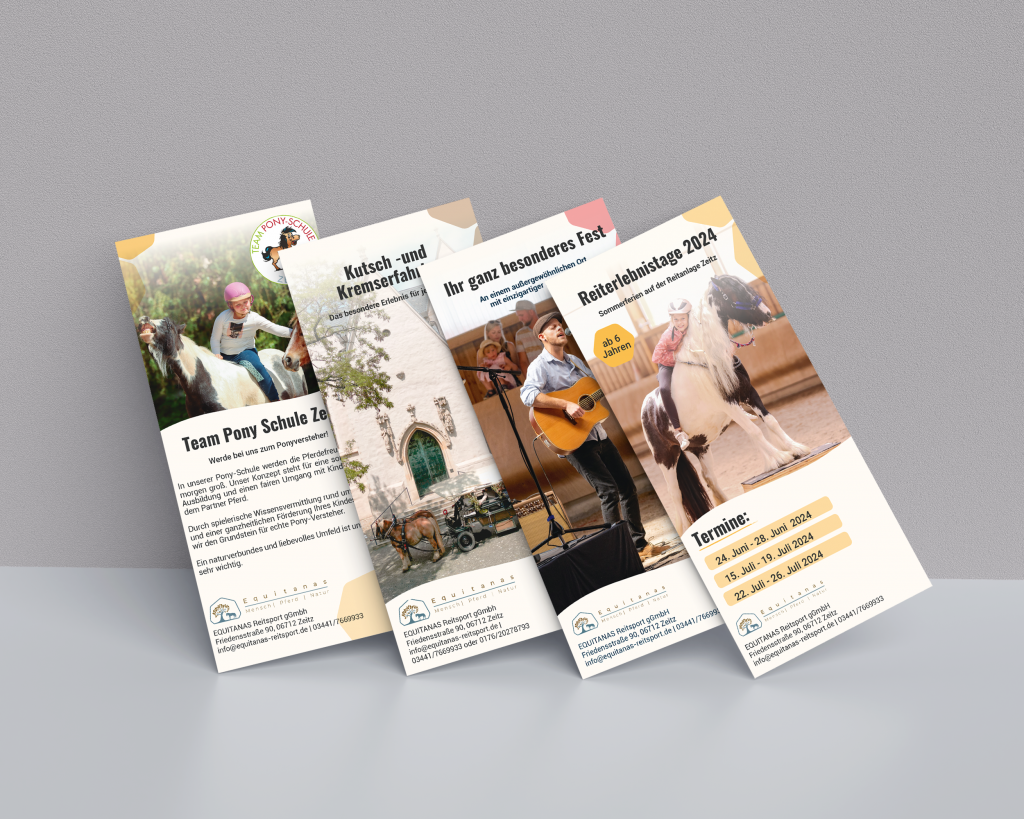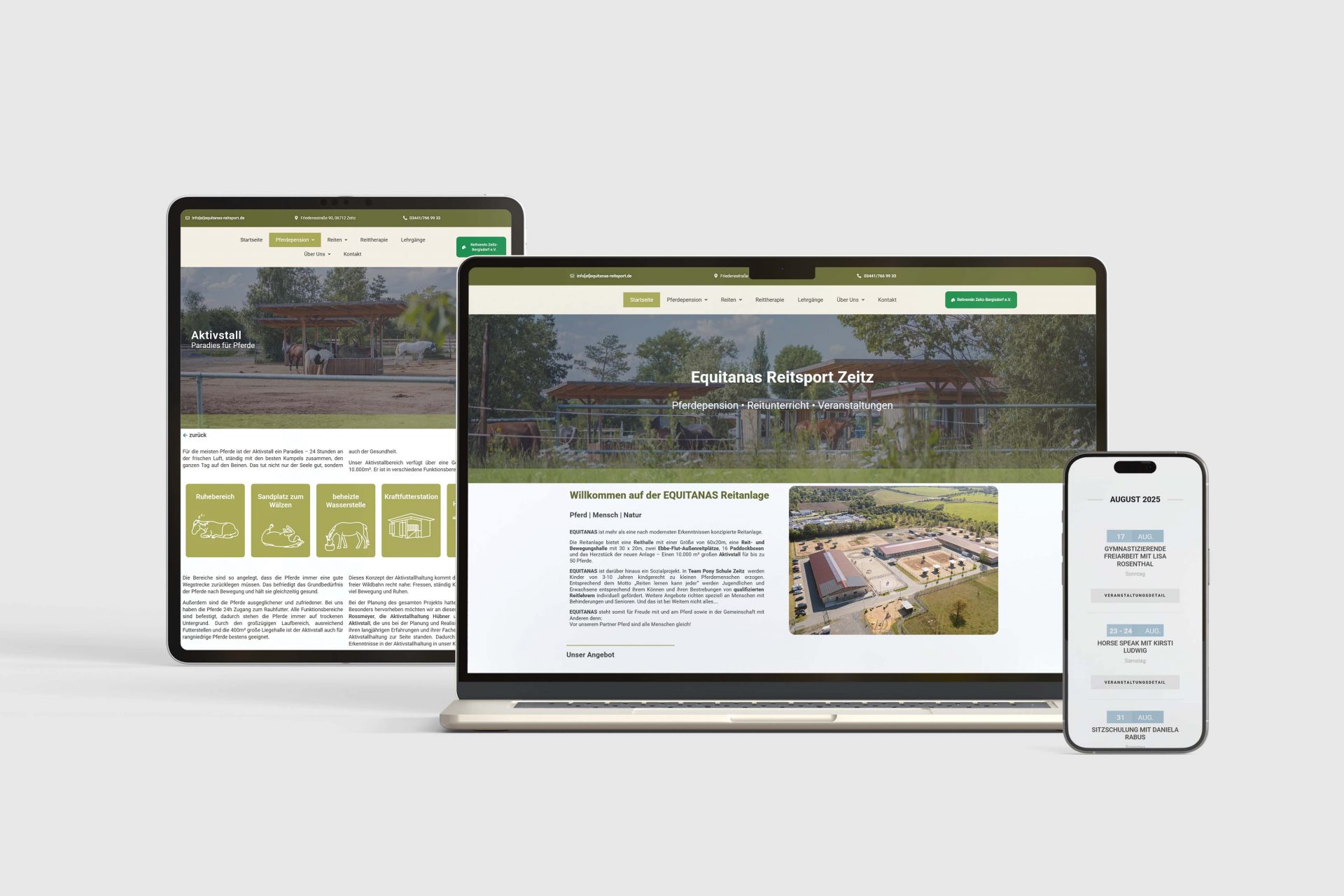 Zu Beginn der Zusammenarbeit stand der komplette Relaunch der Website. Ziel war ein moderner, freundlicher und klar strukturierter Auftritt, der die Besonderheiten und Werte der EQUITANAS-Anlage direkt transportiert. Die neue Website wurde bewusst auf das Wesentliche reduziert: wenige, gut lesbare Absätze, eine klare Bildsprache und selbst gestaltete Icons, die zentrale Inhalte auf einen Blick visualisieren.