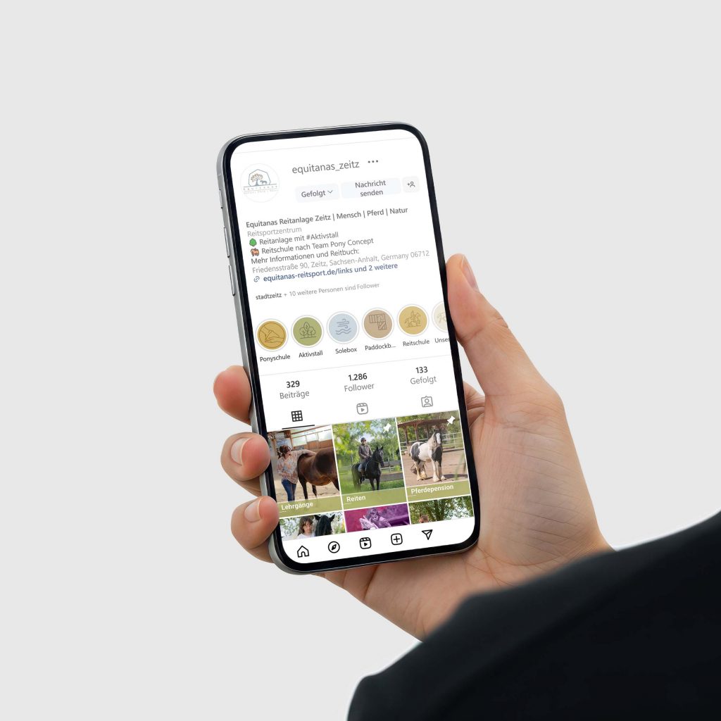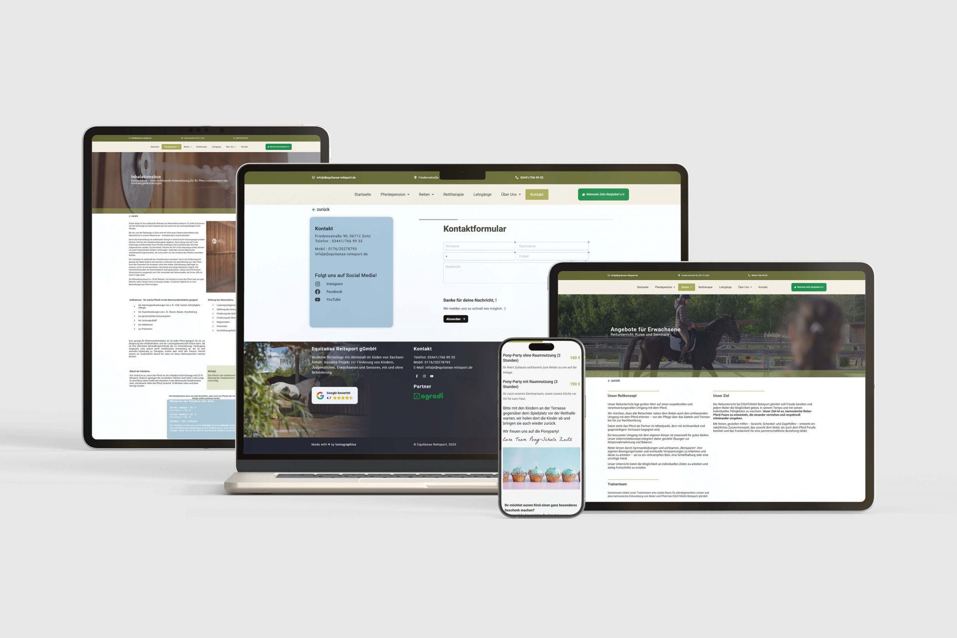 Mehrmals im Jahr finden gezielte Fotoshootings auf der Anlage statt, um aktuelle Eindrücke und saisonale Stimmungen einzufangen. Dabei entstehen authentische, atmosphärisch starke Aufnahmen, die das Miteinander von Mensch und Pferd, den Alltag im Aktivstall und die vielfältigen Angebote von EQUITANAS lebendig abbilden. Die Bilder transportieren Emotionen, Nähe und Natürlichkeit – sei es beim ersten Ponykontakt eines Kindes, beim Reitunterricht oder in Momenten stiller Begegnung. So entsteht eine dynamische, kontinuierlich aktualisierte Bildwelt, die nicht nur auf der Website, sondern auch im Social Media und internen Marketing wirkungsvoll eingesetzt wird.konsistent durch alle Unterseiten der Website und schafft einen hohen Wiedererkennungswert.