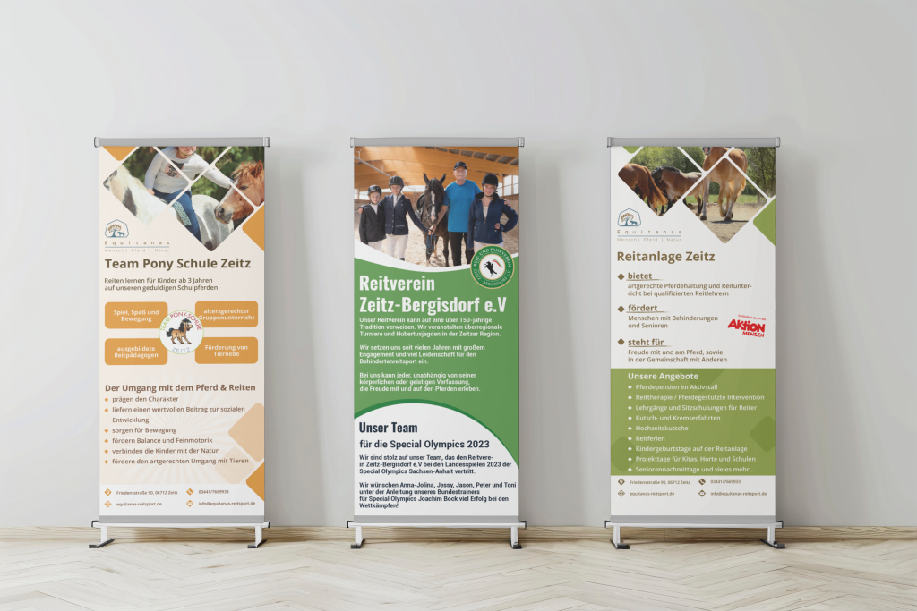 Im Rahmen der Zusammenarbeit mit EQUITANAS habe ich auch das grafische Erscheinungsbild weiterentwickelt und konsequent auf die Bedürfnisse der Zielgruppen abgestimmt. Dabei liegt der Fokus stets auf einer klaren, freundlichen Formsprache, die die Werte der Marke widerspiegelt: Mensch, Natur, Pferd.